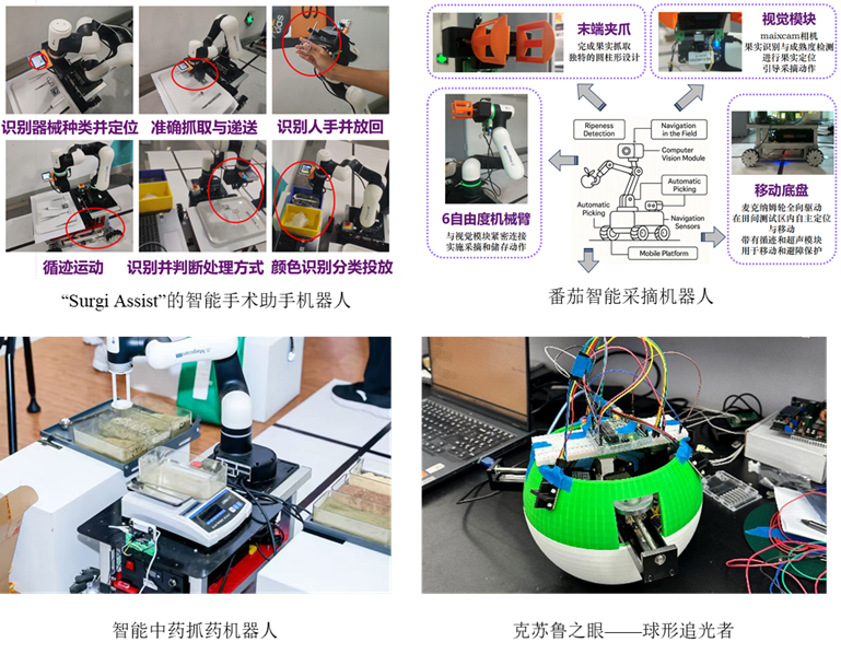 在为期四周的课程中,学生们围绕“智能复合机器人”和“追光者新能源应用产品”两大主题,完成了30余项创新项目。这些作品充分体现了学生在机械设计、电子控制、编程开发和系统集成等方面的综合能力。如李嘉沅、班雨南、张城玮、李马超小组搭建了一款名为“Surgi Assist”的智能手术助手机器人。该机器人融合语音交互、视觉识别和机械臂控制等技术,能够自动识别、抓取和递送手术器械,并通过语音指令进行操作,有效避免了医护人员接触危险器械,降低了交叉感染风险。梁光宇、黎晔瑞、周天桦、林思洋、杨晓苏小组聚焦智慧农业发展趋势,以“番茄采摘机器人”为课题开展创新实践。项目构建了包含视觉识别与定位、机械臂控制与路径规划、自主导航与移动平台三大核心模块的智能系统,成功实现了机器人在模拟农业环境中的自主导航、成熟番茄识别与精准采摘。张婉如、彭淑涵、孟令可、徐晨雨小组紧扣中医药现代化发展需求,以 “智能中药抓药机器人” 为课题开展创新实践。项目聚焦中医门诊抓药场景中效率低、误差大、人工依赖强等痛点,构建了包含视觉识别、机械操作、精准称量、自主移动四大核心模块的智能系统,成功实现了从 “药方码识别” 到 “混合药材配制” 的全自动化流程。莫晗墨、郭浩然、张启慧、何之浩小组以“克苏鲁之眼——球形追光者”为题,开展了一项融合三轴飞轮、光敏感知与质心调控技术的综合性实践研究。该项目不仅成功实现了球形机器人的智能追光与光伏自主供能,更贴近真实科研场景,为未来球形机器人在巡检、救灾等多领域的应用探索了创新路径。