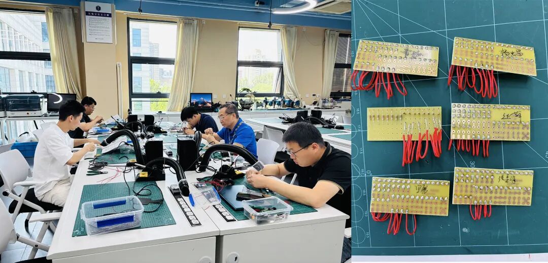 电子工艺技能培训模块主要讲授焊接操作技能。高英老师讲授了安全用电及工具使用的安全与方法,演示了电烙铁的正确使用方法和焊接技巧,强调了安全用电和防护。老师们在练习板上反复练习焊锡工艺,将元件和细导线焊接到电路板上,力求焊点饱满光亮、连接可靠。在掌握基本焊接技能后,参加培训的老师们焊接考核板通过考核。